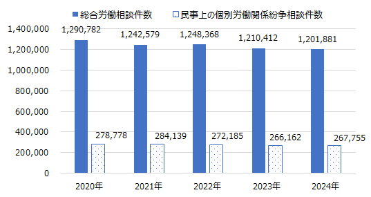大企業の労務相談では、同じ「長時間労働」「ハラスメント」という主訴でも、対応すべき関係者の範囲が中小企業とは桁違いになります。1件の相談が部署横断的な調査に発展したり、類似案件が並行して進行することも珍しくありません。事実、2024年度(令和5年度)の総合労働相談件数は120万1,881件で5年連続120万件超、うちパワハラ相談は都道府県労働局だけで6万件を超えています。